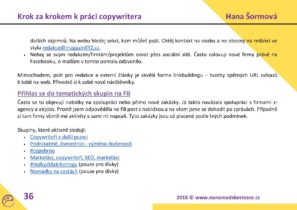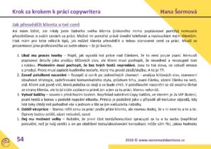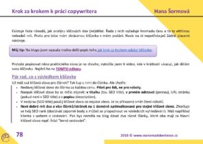 Hani, chtěla bych vám moc poděkovat za váš e-book Krok za krokem k práci copywritera. Je skvěle zpracovaný. Výborná pomůcka pro nás začátečníky. Obsahuje opravdu vše. Jeho podrobný popis a ukázky, jak na to, mi dodává více sebedůvěry, že to zvládnu. Velmi oceňuji, jak mě navádí krok za krokem jak mám postupovat při psaní, na co vše se kolem zaměřit, jak komunikovat s klientem, čemu se vyhýbat a zároveň mě nutí nějakou činnost i vykonat. Při studování e-booku si není třeba pokládat otázku JAK, protože i kdyby, vy ji následně hned zodpovíte. Speciálně já oceňuji i vzorové ukázky nejrůznějších dokumentů. Jsem velmi ráda, že jsem po něm sáhla jako po svém prvním uceleném studijním materiálu. Zbývá to jen uplatnit v praxi a tak to zkouším.