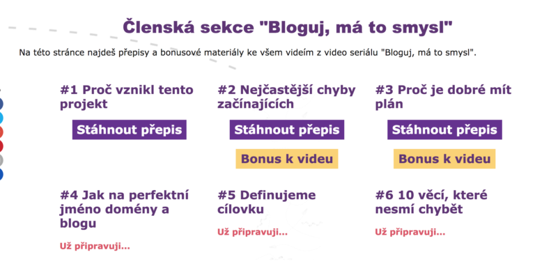 Členská sekce je skvělým doplňkem pro všechny, co poslouchají na YouTube video seriál \"Bloguj, má to smysl\", ale potřebují poznámky v textové podobě. Můžeš si vypracovat cvičení, podtrhat důležité pojmy, najít další zdroje ke studiu. Díky vyhledávání v textu se tak snadno a rychle vrátíš ke staré látce. To se totiž ve videu těžce dělá. Tam těžce dohledáš, kde jsem co zmiňovala.