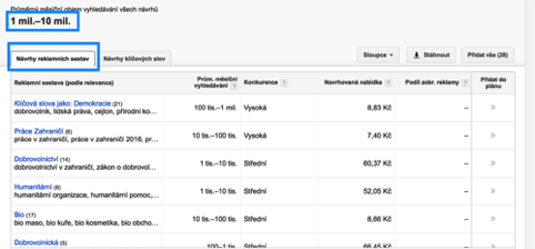 Na co se ale často zapomíná, tak výsledná tabulka má dvě záložky – Návrhy reklamních sestav a Návrhy klíčových slov. Určitě se podívej i do první zmiňované, a to ani když neplánuješ reklamu.