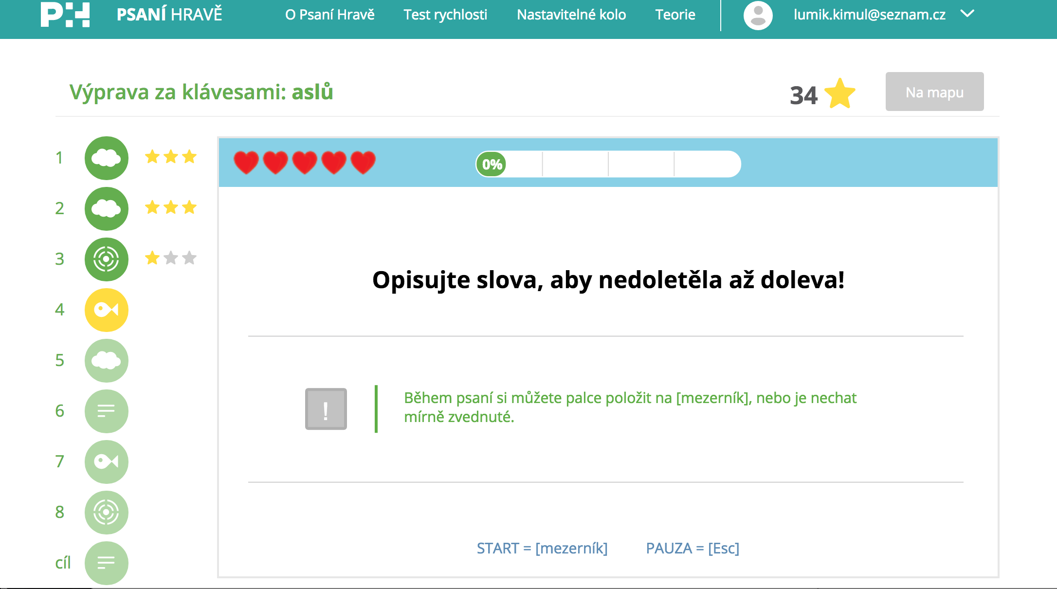 Vraťme se zpátky ke hře. Jirka vyznává heslo po vzoru Komenského “Škola hrou” a v tomto duchu se nese celá výuka psaní. Proto, když se zaregistruješ a zaplatíš poplatek, dostaneš se na mapičku hry s cestami. Na cestách jsou jednotlivá stanoviště se skupinkou písmenek, která musíš zdárně zdolat. Teprve poté se ti otevře cesta k dalšímu stanovišti.